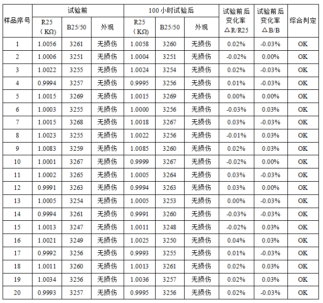 3、測試結(jié)論:測試條件溫度 -196℃±5℃ 保存800±24hrs,技術(shù)要求△R/R25≤±1% △B/B≤±1% 外觀無損傷。從以上測試數(shù)據(jù)可看到,我司NTC熱敏電阻產(chǎn)品在經(jīng)過-196℃±5℃的液氮800小時測試后,產(chǎn)品無論是阻值性能,外觀都沒有發(fā)生太大的變化率。可見產(chǎn)品具有良好的耐冷循環(huán)能力,并且穩(wěn)定性良好。