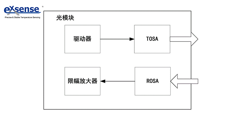 圖中光模塊,包括發(fā)送通道的光發(fā)射組件TOSA、用于驅(qū)動TOSA中的激光器的驅(qū)動器,以及接收通道的依次連接的光接收組件ROSA和限幅放大器。結(jié)合參看圖1,驅(qū)動器包括激光器驅(qū)動芯片,激光器驅(qū)動芯片連接TOSA中的激光器,激光器驅(qū)動芯片連接光功率第一電阻,光功率第一電阻為NTC熱敏電阻RNTC。NTC熱敏電阻RNTC在常溫25度時阻值為50KΩ,高溫90度時阻值為8KΩ,NTC熱敏電阻RNTC的阻值隨溫度升高而逐漸降低。