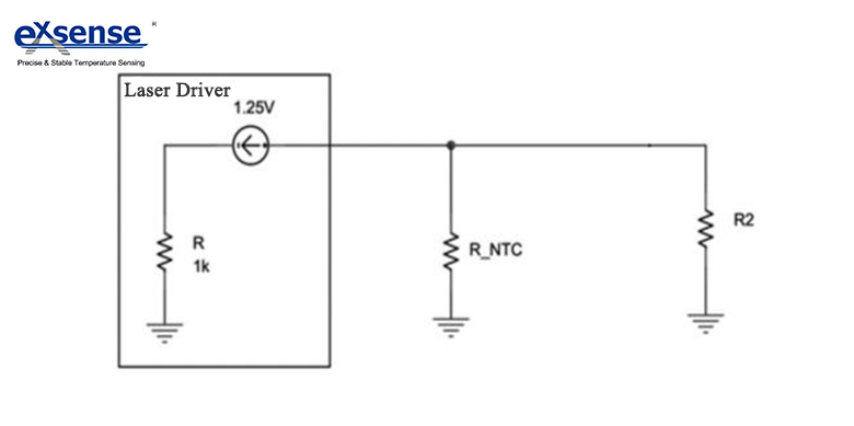 NTC熱敏電阻RNTC安裝在激光器驅(qū)動芯片的外圍電路中。對于一般的激光器驅(qū)動芯片,外圍電路是一定存在的,電阻R為激光器驅(qū)動芯片內(nèi)部電阻,由激光器驅(qū)動芯片內(nèi)部結(jié)構(gòu)決定。該電路還包括光功率第二電阻R2,光功率第二電阻R2和光功率第一電阻RNTC并聯(lián)一起組成激光器驅(qū)動芯片的外圍光功率電阻R,其中R、RNTC和R2滿足以下關(guān)系式: