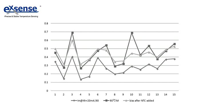 上圖是在維持光功率不變的情況下,對比測試現(xiàn)有光模塊與采用本方法后的光模塊的偏置電流示意圖。其中,90℃IM曲線表示激光器在高溫(90℃)情況下,維持正常光功率需要的偏置電流BIAS;Im@ith+20mA|90曲線是高溫(90℃)情況下,實際測得的光功率偏置電流BIAS;bias after NTC added曲線表示加入NTC熱敏電阻以后,在高溫(90℃)情況下實際測試得到的光功率偏置電流BIAS。由此可以看出,Im@ith+20mA|90曲線與90℃IM曲線相差較大,而bias after NTC added曲線與90℃IM曲線更加一致,體現(xiàn)了加入NTC熱敏電阻可以有改善光模塊跟蹤誤差不良現(xiàn)象。由于增加了NTC熱敏電阻,從而使由于TE不良而光功率變小的光模塊輸出光功率基本恢復到正常光功率范圍,避免了TOSA或BOSA器件的浪費,節(jié)省生產(chǎn)成本。